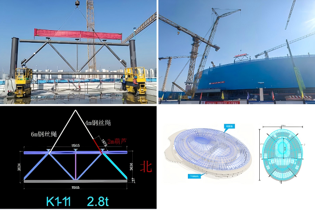 本次首吊的鋼桁架位于屋蓋起始安裝區(qū)域,單榀重量2.8噸。面對屋蓋結(jié)構(gòu)面積大、體量大、跨度大,構(gòu)件節(jié)點三維坐標精確定位難等挑戰(zhàn),集團建設團隊創(chuàng)新采用“地面拼裝、整榀吊裝”方案,多臺大型起重機械協(xié)同作業(yè)。同時,通過強化計算分析、嚴控拼裝精度、精準測量定位、嚴把焊接質(zhì)量,確保吊裝安全與施工質(zhì)量雙可控,助力實現(xiàn)首吊圓滿成功。